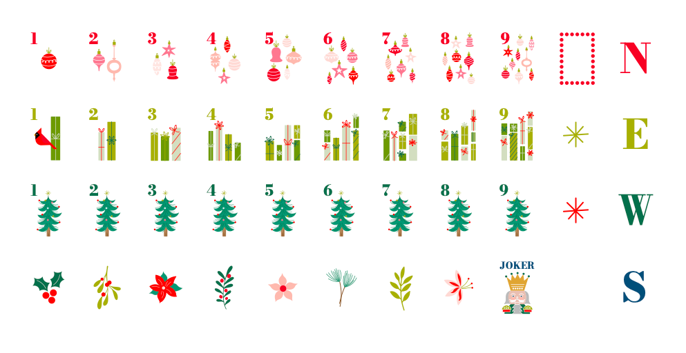 The winds, dragons, flowers, and jokers carry the holiday theme through with coordinating seasonal icons and a cohesive red, green, and soft neutral palette that feels bright, nostalgic, and timeless.