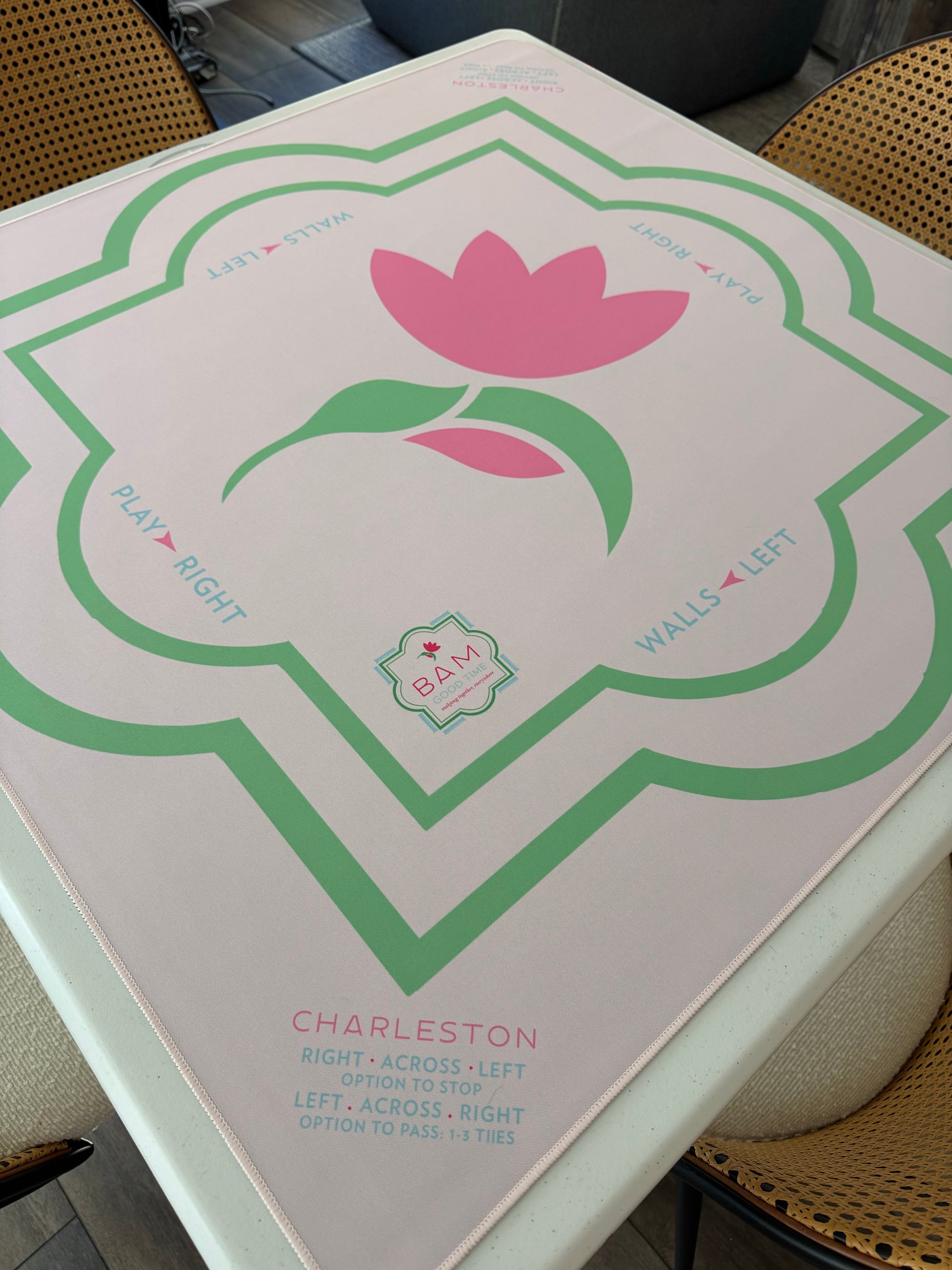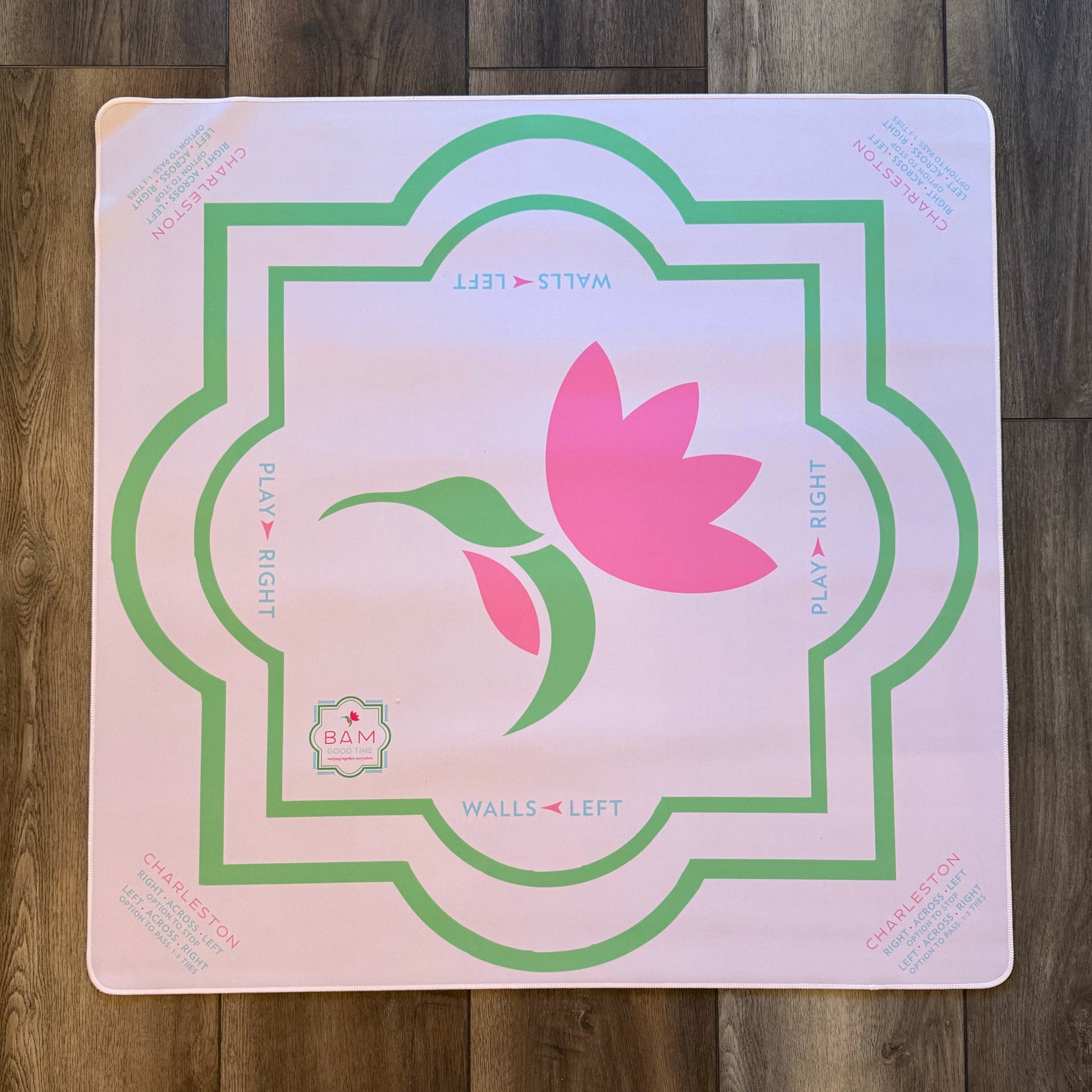 The Miramar Mahjong Mat features a soft blush background, fresh green frame, and our signature Bam Good Time hummingbird in bold pink at the center. It’s pretty, playful, and designed to keep the table calm so you can focus on cracking the card and calling Mahjong.